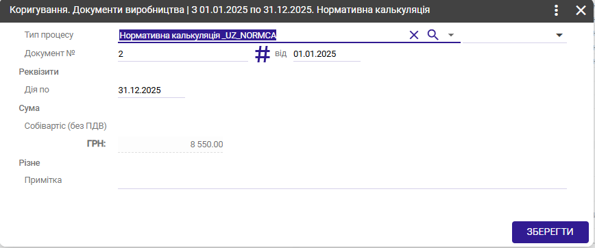 Документ "Нормативна калькуляція продукції, послуг" потрібен для внесення планових витрат в розрізі кожного виду продукції. В заголовку документу зазначається номер, дата документу і дата, до якої діє документ: