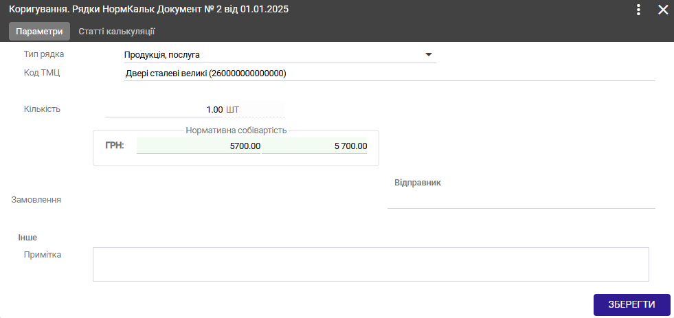 В рядку документу на вкладенні "Параметри" обирається продукція (послуга), для якої проводимо розрахунок і кількість (як правило 1), інші додаткові параметри: