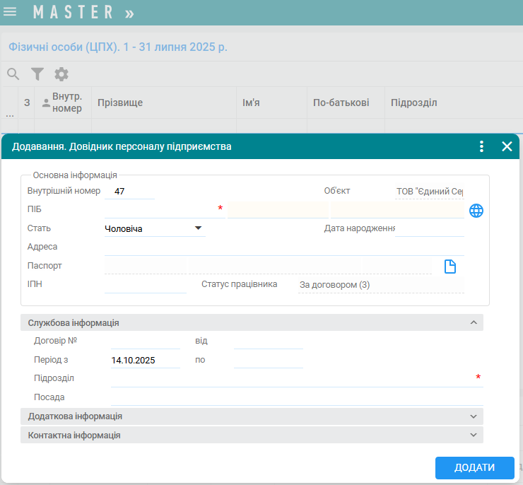 Внесення працівників за договором ЦПХ відбувається в меню "Кадри" - "Фізичні особи (ЦПХ)":