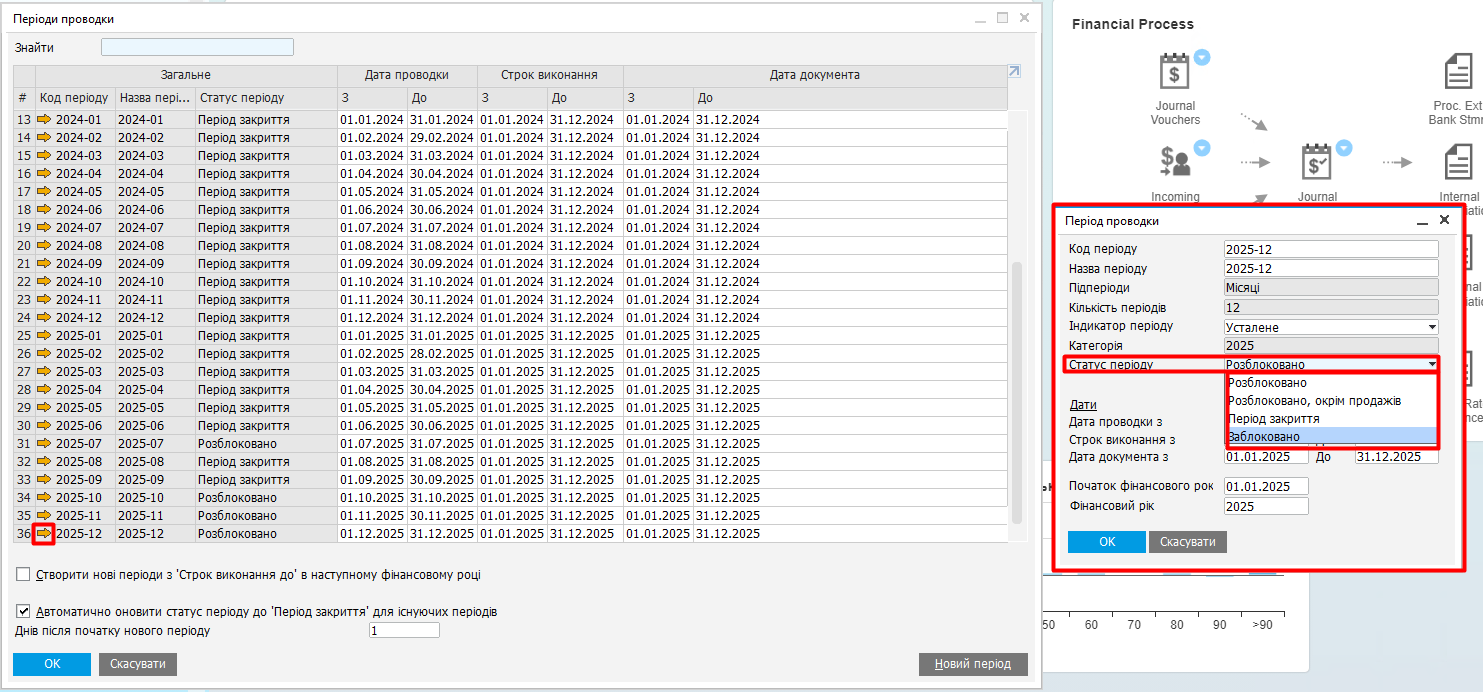 ПКМ по рядку → Змінити статус періоду (Right-click → Change Period Status) і встановіть:
