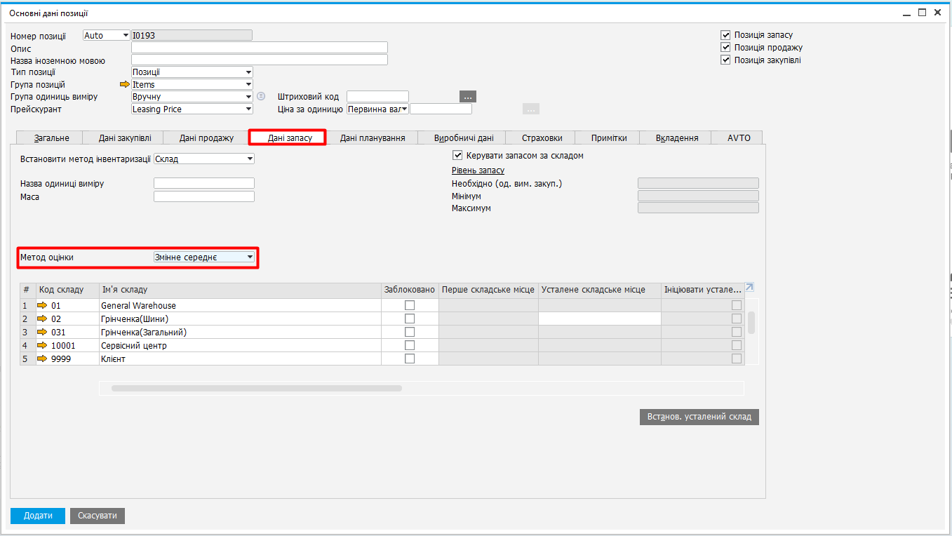 Запаси → Основні дані позиції → [Додати] → вкладка Дані Запасу (Inventory Data) → поле Метод оцінки (Valuation Method)