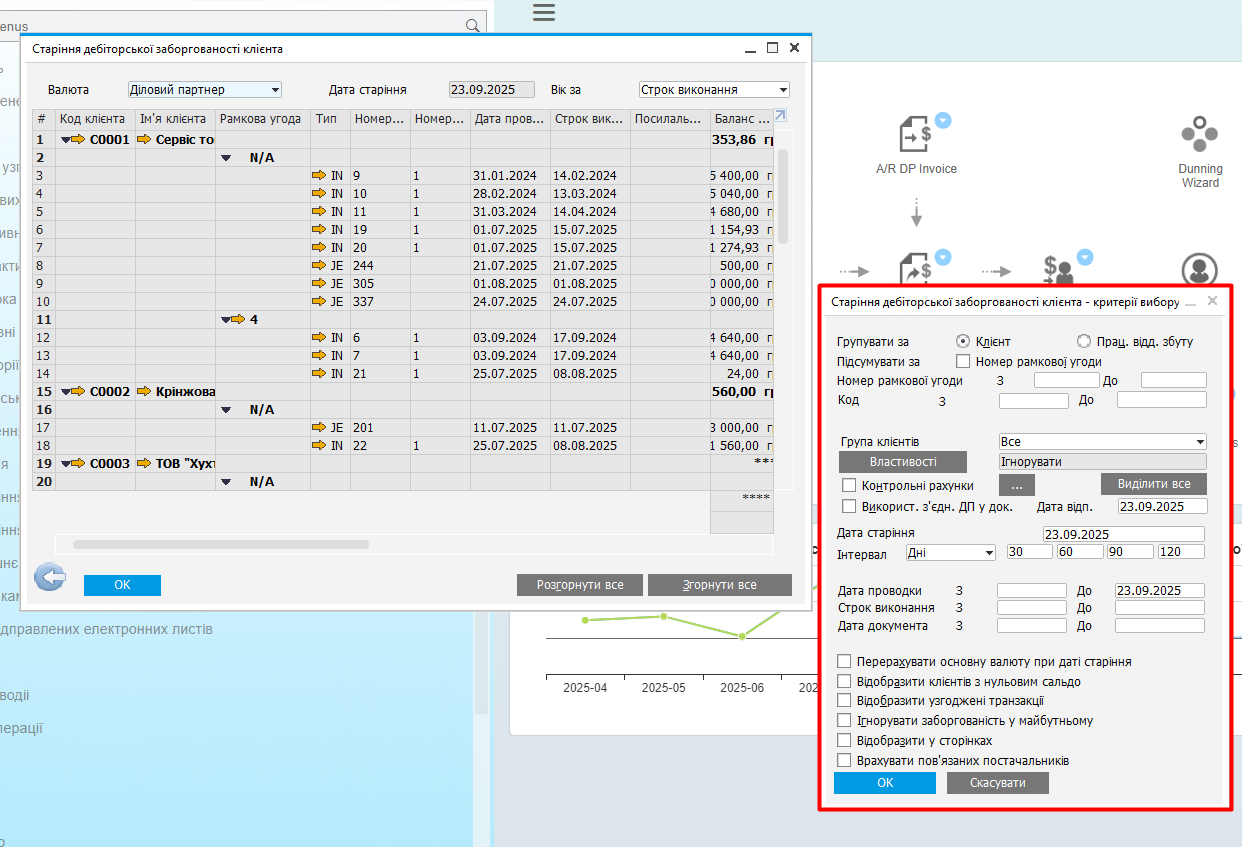 Ділові партнери → Звіти ділових партнерів → Старіння → Старіння дебіторської заборгованості клієнта (Business Partners → Business Partner Reports → Aging → Customer Receivables Aging)