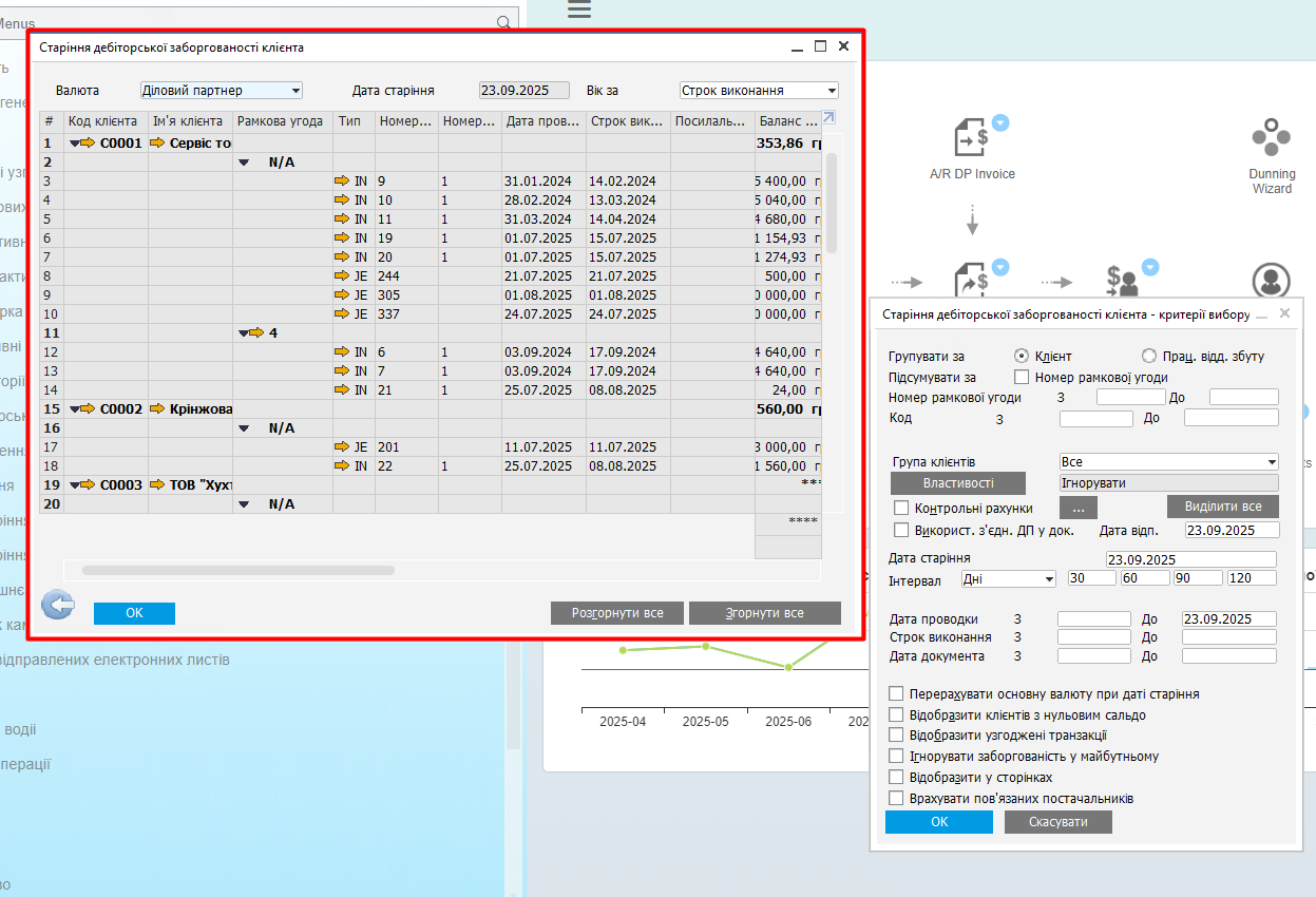 У разі потреби встановіть і інші не обов'язкові поля та фільтри. Натисніть ОК — звіт покаже борг у потрібних інтервалах; подвійний клік відкриває деталі документів.