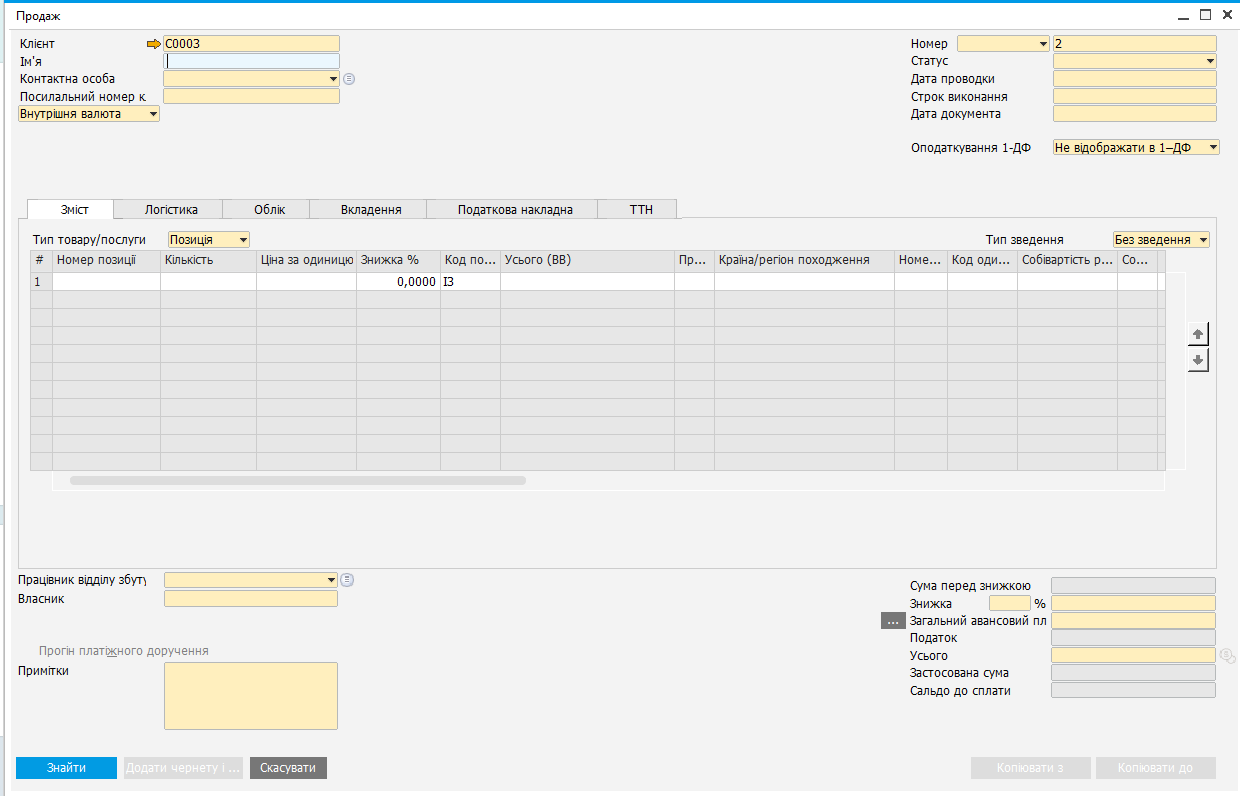 1. Відкрийте форму потрібного документа (наприклад: Продажі → Продаж).