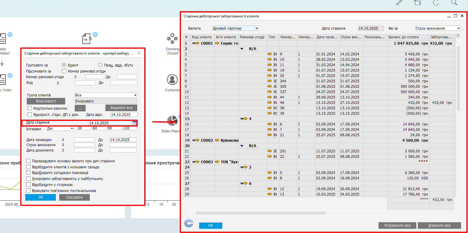 Шлях: Ділові партнери → Звіти ділових партнерів → Старіння → Старіння дебіторської заборгованості клієнта (Business Partners → Business Partner Reports → Aging → Customer Receivables Aging) - Встановіть дату