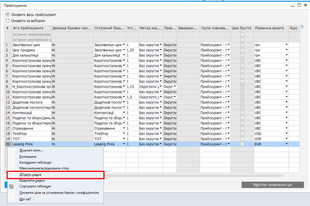 Запаси → Прейскуранти → Прейскуранти (Inventory → Price Lists → Price Lists)– Створіть окремі прайси, за потреби задайте базовий прайс + коефіцієнт (Base List + Factor) або внесіть ціни вручну по товарах.