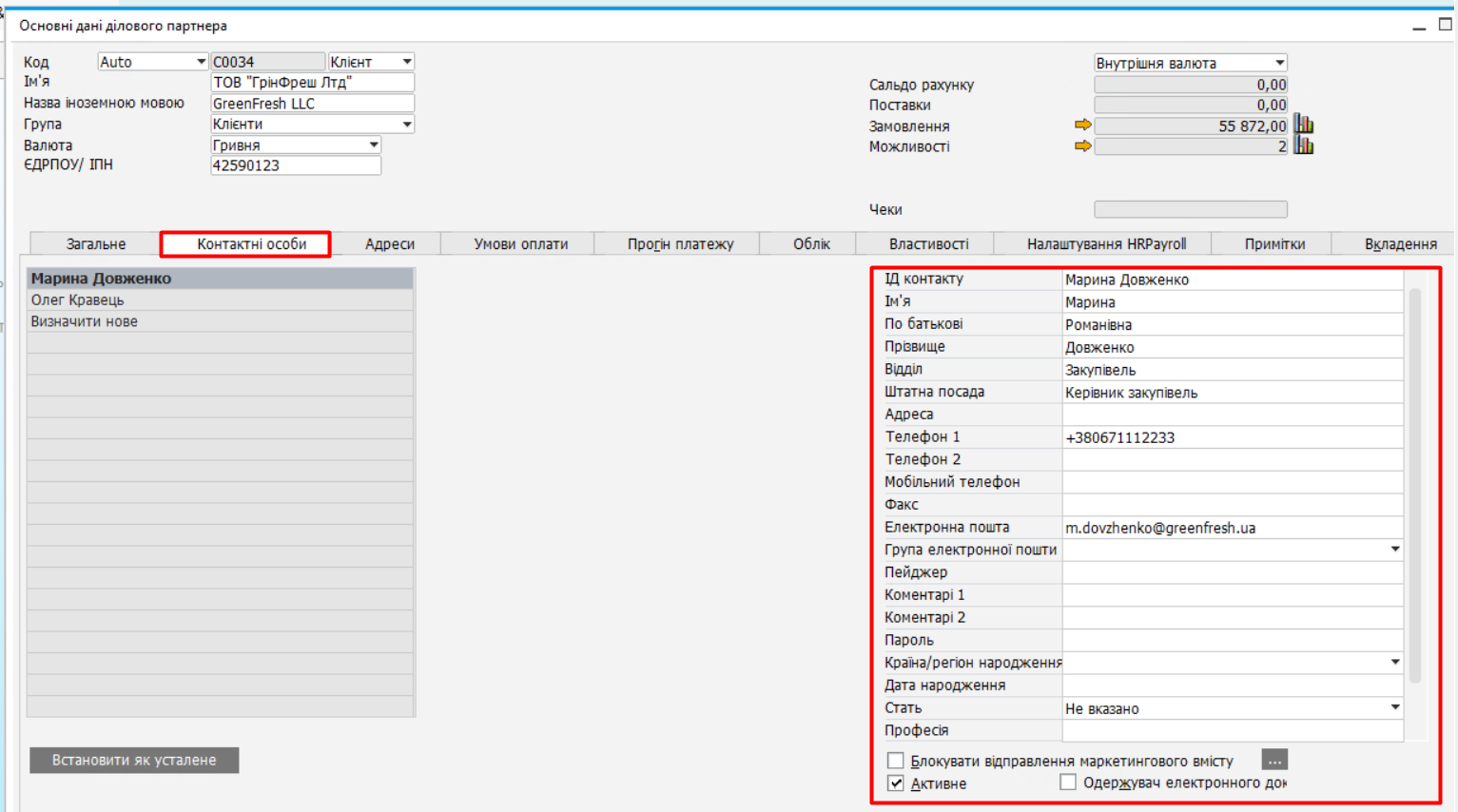 Якщо вам потрібен загальний телефон самої компанії (а не конкретної людини), він знаходиться на вкладці «Загальне» (General) у відповідних полях "Телефон 1" / "Факс". Але для робочої комунікації майже завжди потрібна саме вкладка «Контактні особи».