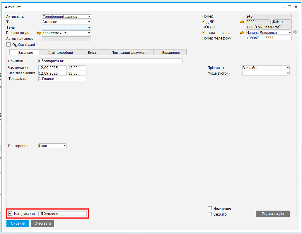 — у Власник / Assigned To вкажіть того, хто має отримати нагадування. Додати/Оновити (Add/Update).