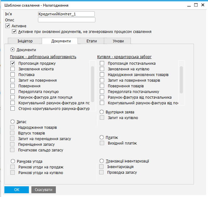 - Документи (Documents): виберіть типи (напр., Замовлення клієнта, Рахунок-фактура).