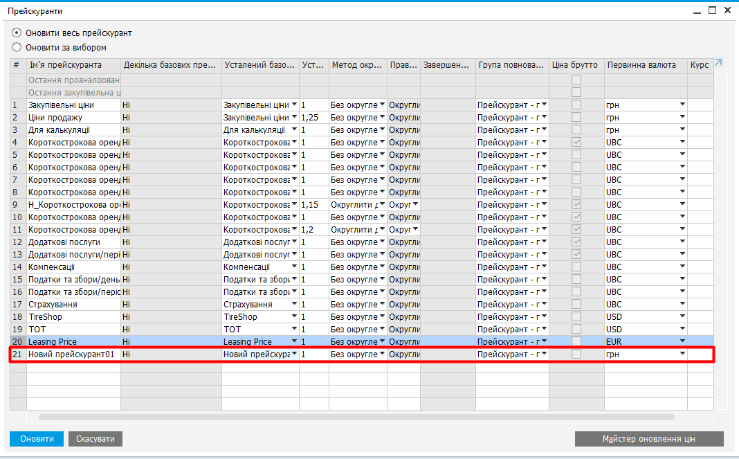 Запаси → Прейскуранти → Прейскуранти