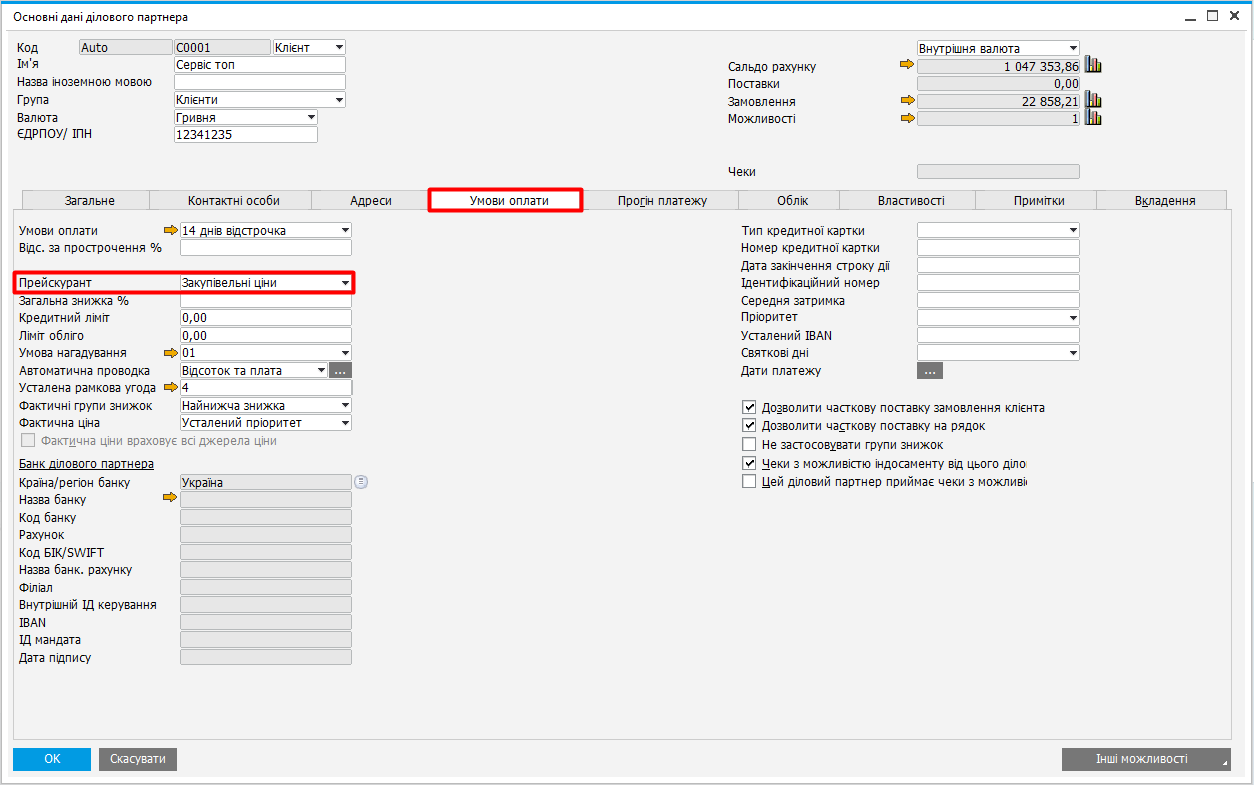 Ділові партнери → Основні дані ділового партнери → [клієнт] → вкладка Умови оплати → поле Прайс-лист