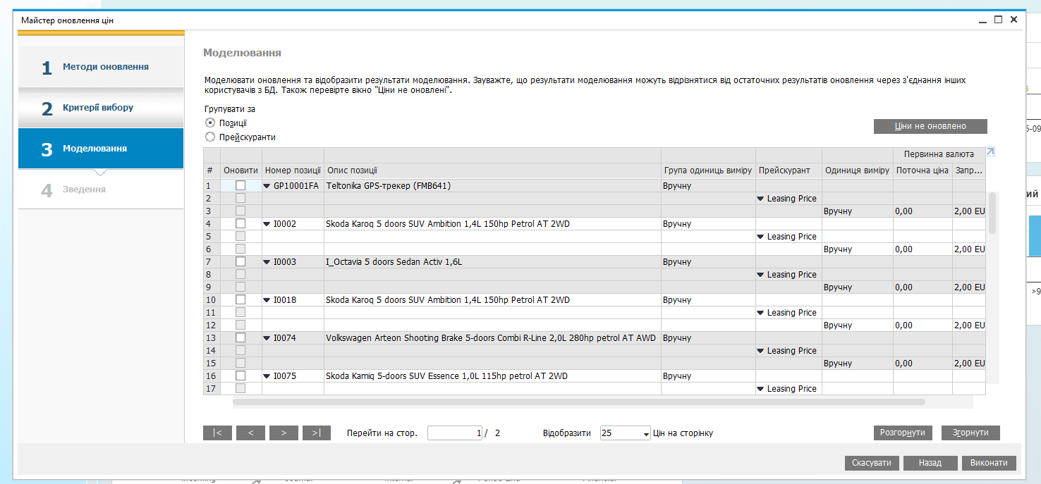 - У «Моделюванні» ціни не змінюються — це лише попередній перегляд; зміни вносяться після «Виконати».